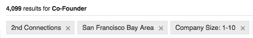 Click on “Advanced” to the right of the search box and search for 2nd Connections, Company Size: 1-10, Keyword: Co-founder, Location: San Francisco. Like Facebook’s search, you’ll find a ton of people you are loosely connected with working at interesting startups.